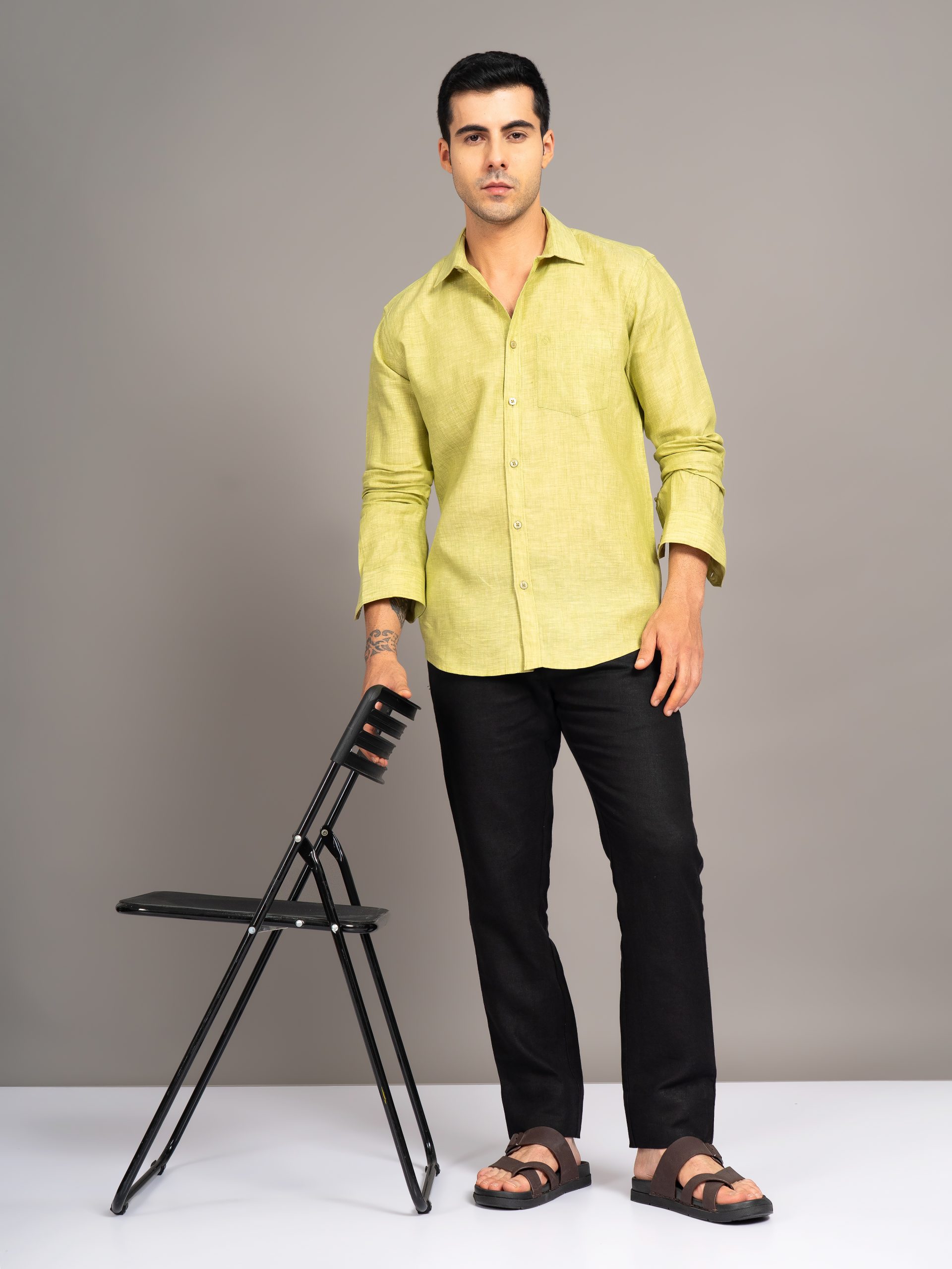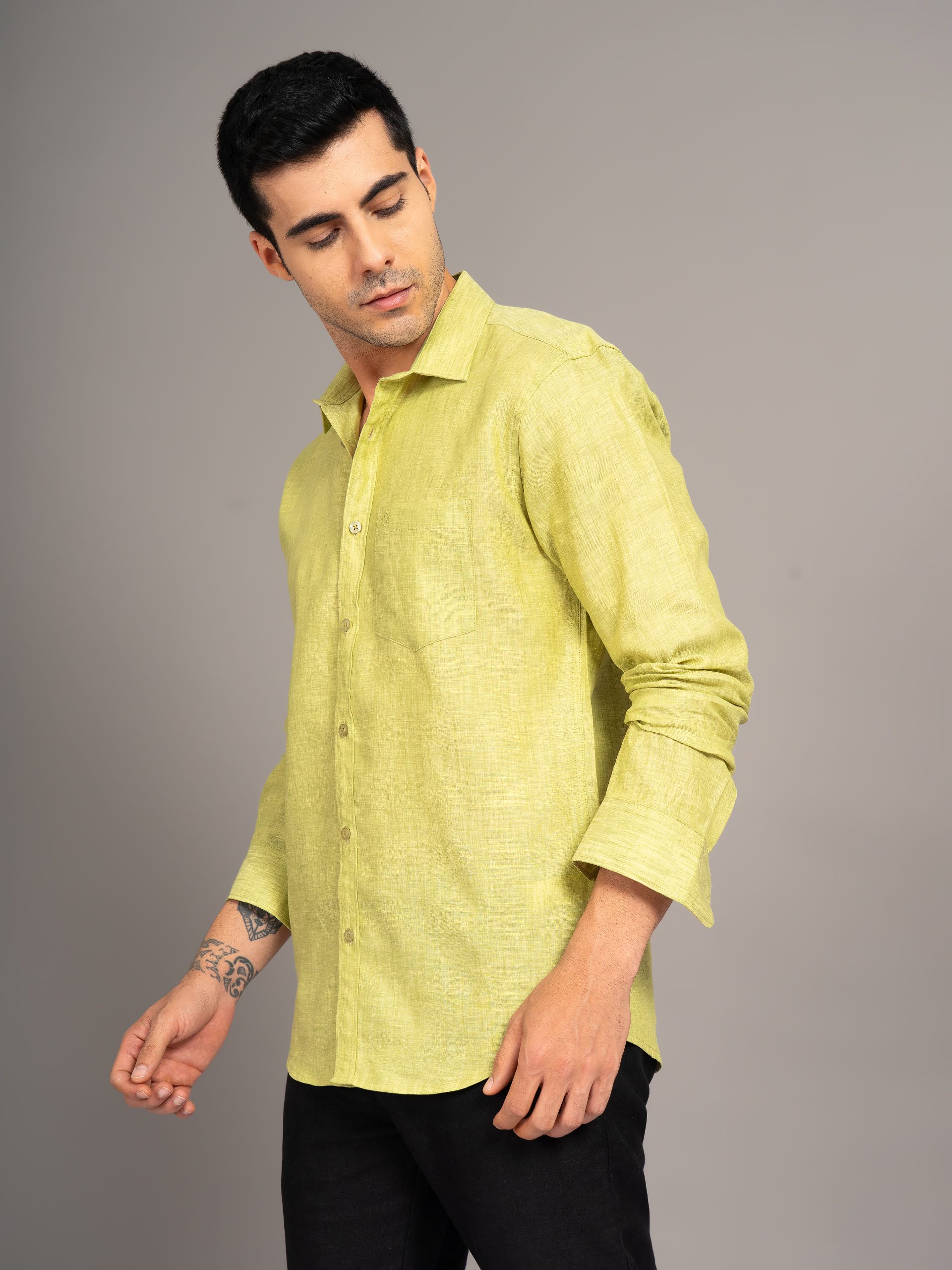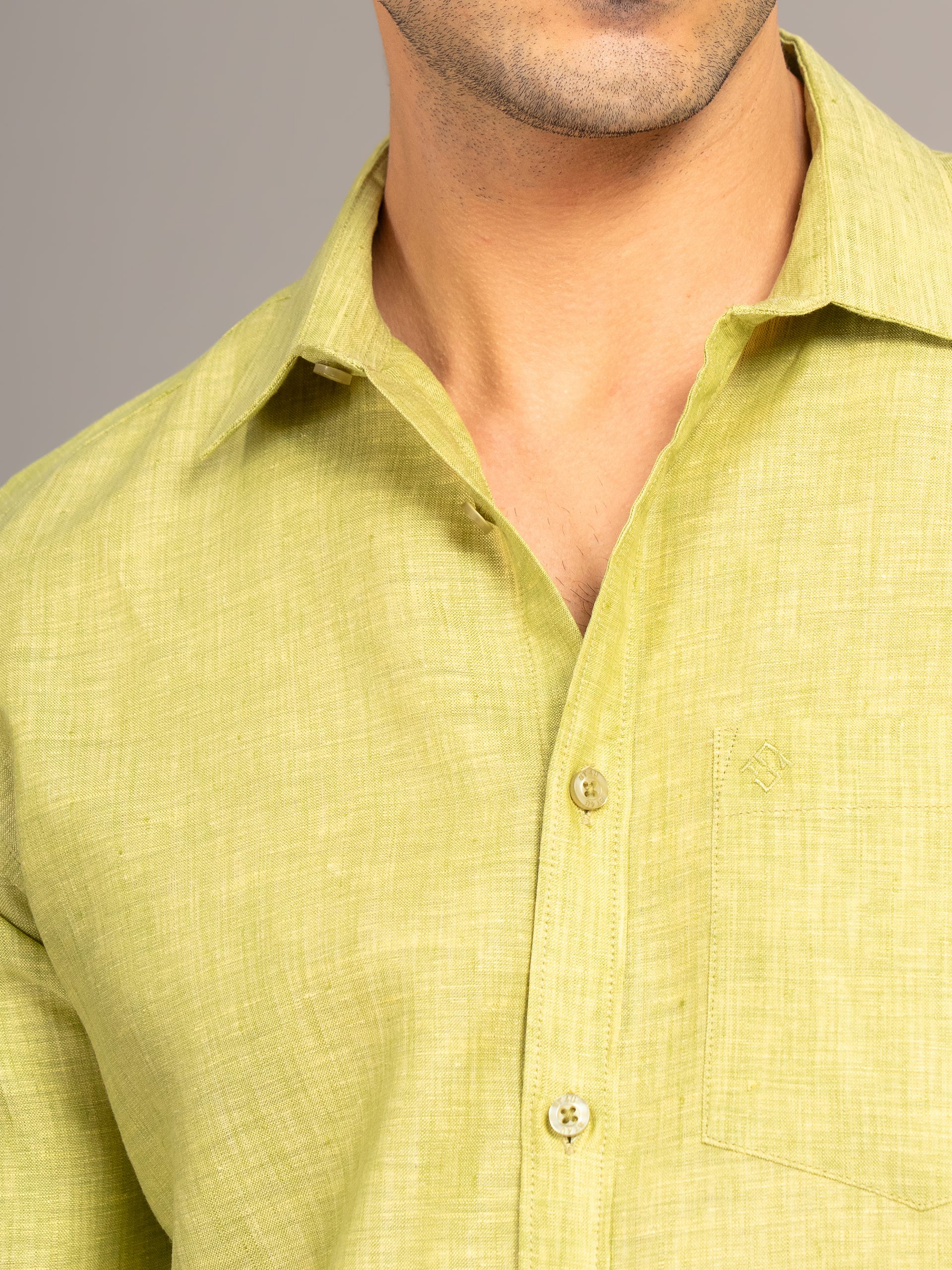MENS PURE LINEN 60LEA CHAMBRAY SHIRT – PLUM GREEN – FULL SLEEVE