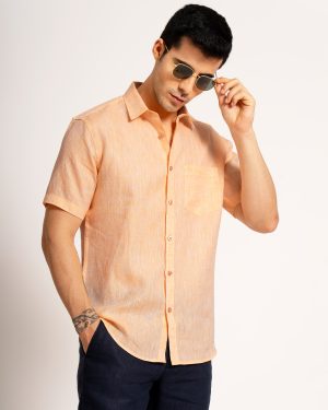 MENS PURE LINEN 60LEA CHAMBRAY SHIRT – ORANGE – HALF SLEEVE